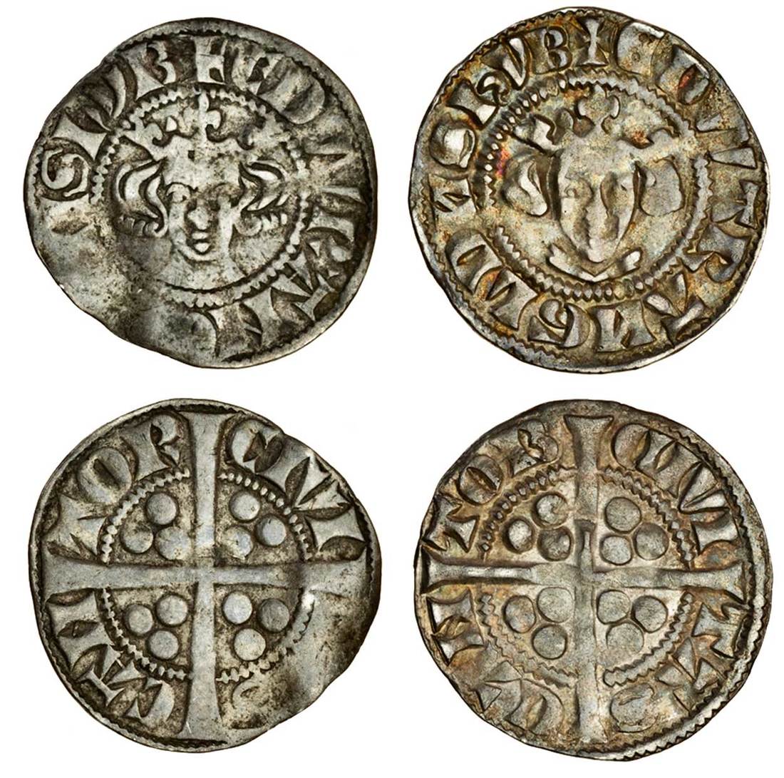 Long Cross, Sterlings (2), Edward I (1272-1307), ‘Canterbury’ Pennies, 1.06g, +edwr’ang[ ]nshyb, facing bust, rev. civi tas can tor, long cross, three pellets in each angle, fine, another, this similar to Class 10, 1.39g, +edwraиgldиshyb, facing bust, rev. civi tas can tob, long cross, three pellets in each angle, attractively toned, very fine (Mayhew 375; Mayhew 377, cf. SNC May 1975, fig.10 same dies), (2)