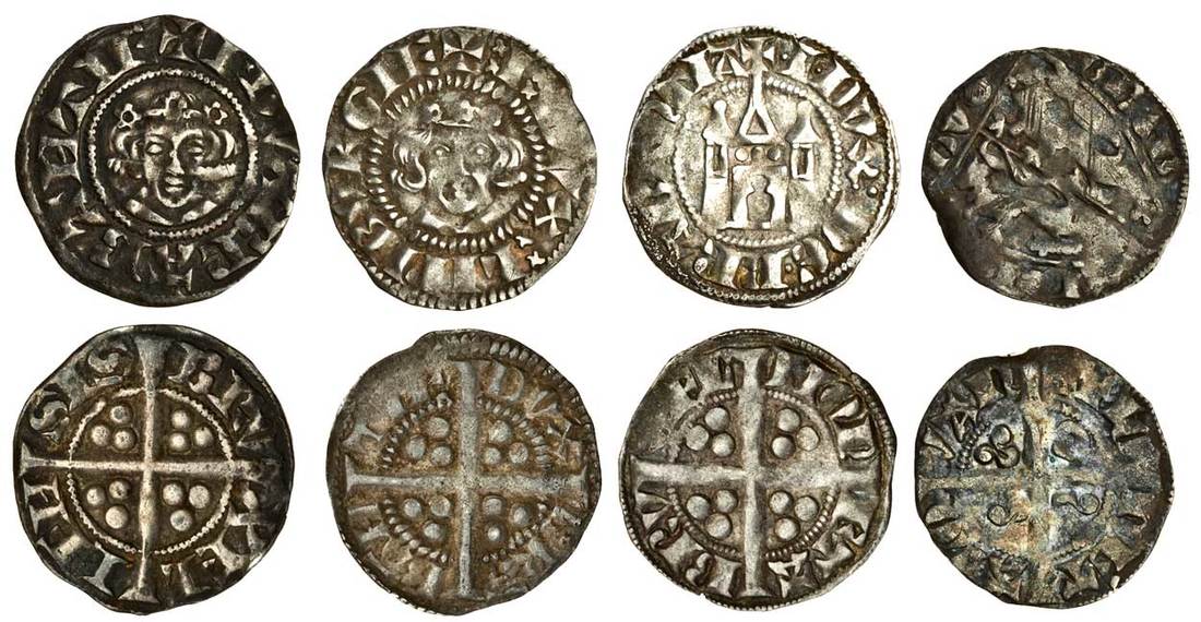 Long Cross, Sterlings (4) Brabant, Jean I (1261-94), 1.40g, +i:dvx:brabaиtie, facing bust, rev. brv xel leи sis, nearly very fine, 1.40g, +:i:dvx:limbvrgie, facing bust, rev. dvx bra ban tie, nearly very fine, (Jean III (1312-55), 1.39g, +i•dvx:de•brabantia, city gate, rev. mon eta brv xel’, nearly very fine, Louvain, 1.03g, Jean II (1294-1312), obv. dvx/brab/ant[ ], flat topped spade shield, legend around, rev. +mo net alo van, long cross, lyre ornaments in three angles, the other a rose, irregular, near fine (Chautard pl.VIII/11, Mayhew 40; Chautard pl.VIII/10, Mayhew 43; Chautard pl.IX/9; Chautard pl.IX/5), (4)