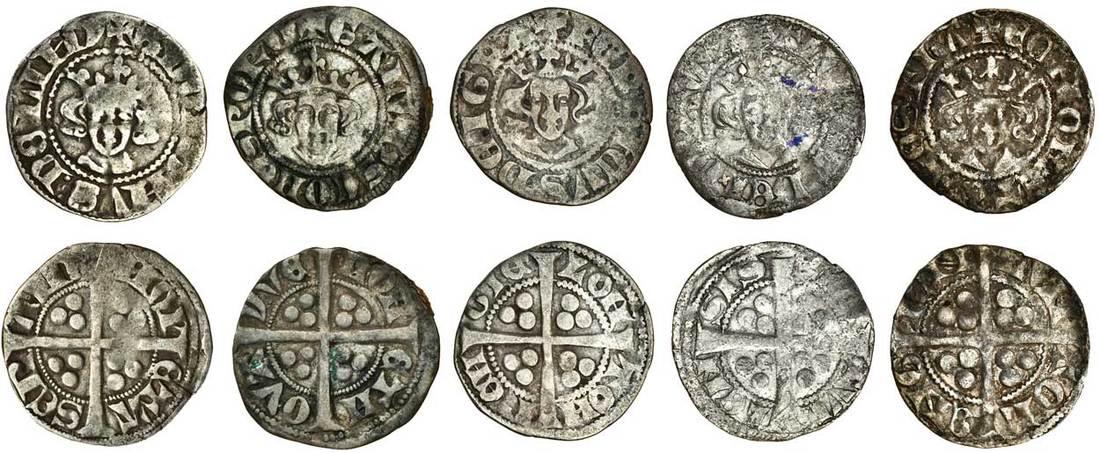 Long Cross, Sterlings (5), Ligny, 1.14g, Valeran II (1304-1353), obv. +g dominvs:de liny, crowned facing bust, rev. mon eta ser ain, voided long cross, three pellets in each angle, weak in parts, about fine, Porcien, 1.40g, Gaucher de Châtillon (1303-29), Yves, obv. +galchscomesporc, crowned facing bust, rev. mon eth ova yve, voided long cross, three pellets in each angle, good fine, Lorraine, 1.16g, Ferry IV (1312-28), obv. +ferricvs dei gra, crowned facing bust, rev. loh toh reh gie, long cross, three pellets in each angle, fine, Toul, 0.77g, Bp. Thomas de Bourlement (1330-53), obv. thomas deixgracia, crowned facing bust, rev. [ ] tvl ien sis, long cross, three pellets in each angle, fair, Toul, 0.99g, Lorraine (c1320), +ec moneta nostra, facing bust, rev. lvn tol eng ien, long cross, three pellets in each angle, fine (Chautard pl.XVIII/4 & Mayhew 122; Chautard pl.XIX/3 & Mayhew 238; Chautard pl.XVI/2 & Mayhew 303; Chautard pl.XVI/5; Mayhew 311 ), (5)