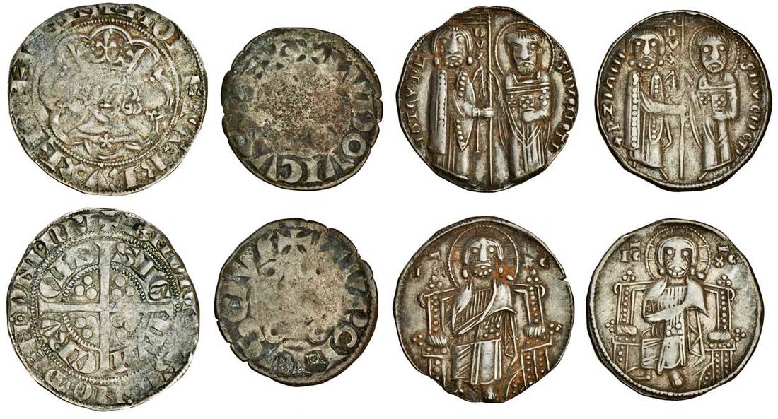 Brussels, Demi-Gros, 2.01g, (c1338), +moneta x brvxellensis, crowned facing bust within tressure of 8 arcs, rev. +bndictv’ sit:nomen:dni:nri, around cross pattée, sig/nvm/crv/sis , three pellets in each angle within, weak in places, fine (dW 354), France, Louis VIII (123-6) or IX (1226-7), Denier, 1.02g, Tournois, obv. +lvdovicvsrex•, large cross, rev. +tvronvscivi, stylised church, flat centres, poor-fair; Italy, Venice, Grosso (2), 2.14g, Pietro Ziani (1205-28), +p•ziani / •smveneti /d/v/x, Doge and St Mark standing facing, rev. Christ enthroned facing, light wear, very fine/nearly very fine, 2.17g, Jacopo Tiepolo (1228-49), •iatev•pl• / •smveneti• /d/v/x, Doge and St Mark standing facing, rev. Christ enthroned facing, (Paolucci p.17) very fine (4)