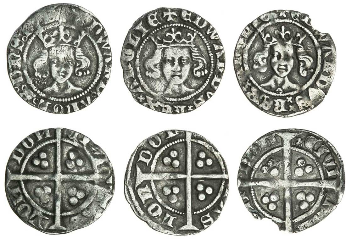 Edward III (1327-77), Pennies (3), London, fourth coinage, treaty/post treaty mule, 1.02g, mm. cross pattée, edward angl r dns hyb, annulet stops, Lombardic Ns, rev. civi tas lon don, chevron barred a, post-treaty period; type 2b, 1.03g, edwardvs rex anglie, saltire stops, large head, nothing on breast, rev. Lombardic Ns, pellet before lon; type 3, 0.94g, small head, cross on breast, rev. unbarred Ns, saltire at start of legend, two extra pellets in lon quarter (LAL.1, 10/9, 15; N.1264/1291, 1292 (2); S.1625/1642, 1642, 1644; Stewartby p.266), the third chipped and cracked, otherwise very fine, rare (3)