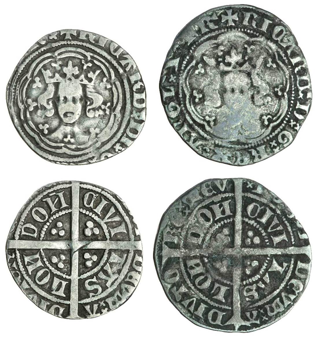 Richard II (1377-99), Halfgroats (2), London, type II, 1.57g, mm. cross pattée, ricard di g rex angl z fr, saltire stops, rev. posvi devm adivtorem mev, saltire stops, civi tas lon don, reversed Ns; 1.80g, ricard d g, 3 pellets above crown, rev. adivtore, saltire stop at start of legend, civi tas lon don, reversed Ns, (Potter -/Ib, II-1/IIb; N.1322; S.1682; Stewartby p.263), the first clipped, good fine, the obverse die unrecorded by Potter, extremely rare, the second nearly fine and scarce (2)