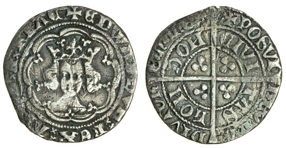 Richard II (1377-99), Halfgroat, London, using old obverse die of Edward III, 2.14g, mm. cross pattée, edwardvs rex angl z frac, saltire stops, Lombardic N, rev. posvi devm adivtorem mev, saltire stops, civi tas lon don, reversed Ns (Potter 1/IIIa; N.1324; S.1684; Stewartby p.263 and pl.14/280 this coin), fine with a few surface marks, very rare