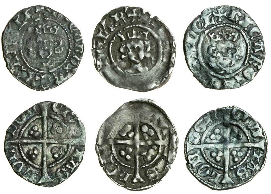 Richard II (1377-99), Halfpennies (3), London, type III, Intermediate style, 0.56g, mm. cross pattée, ricard rex angl, saltire stops, Lombardic N, fishtail letters, rev. civi tas lon don, Lombardic Ns, extra pellet under t; type IV/III mule, Late style, 0.55g, ricard rex angl F, saltire stops, rev. as previous; type IV, 0.74g, short, stubby letters, broken i punch (N.1332a, 1332b/1332a, 1332b; S.1700, 1700A/1700, 1700A; Stewartby p.268), good fine to nearly very fine, the third cracked, the second extremely rare (3)