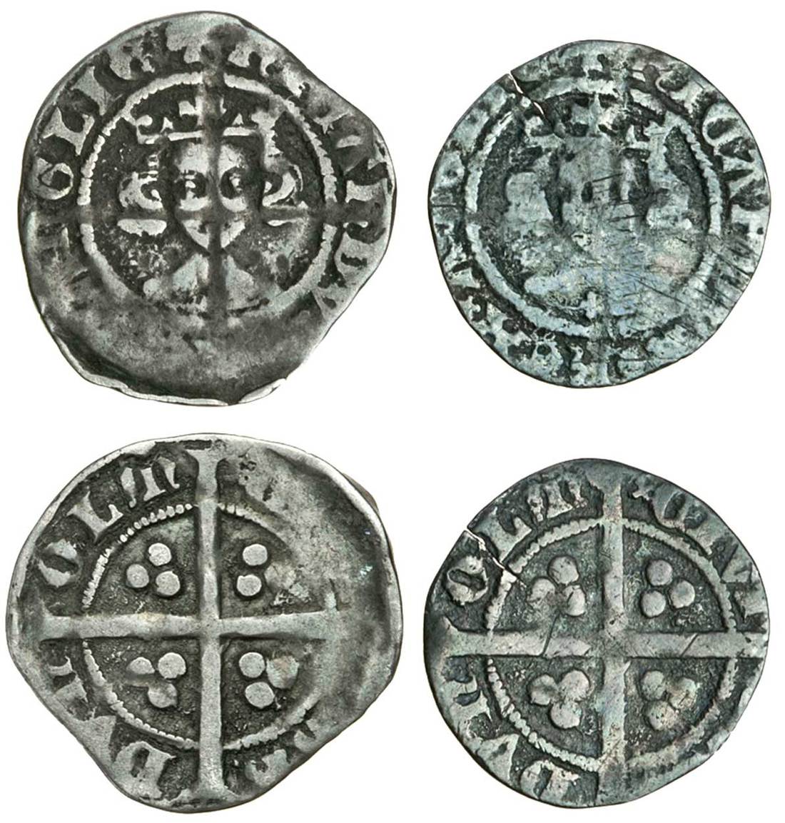 Richard II (1377-99), Pennies (2), Durham, type Ia, 1.07g, mm. cross pattée, ricardvs rex anglie, lis on breast, rev. civi tas dvn olm, Lombardic Ns, three pellets in each angle, a saltire before civi; 0.72g, as previous coin, but from a different obverse die (N.1328; S.1697; Stewartby p.266), the first flat in parts, nearly very fine, the second cracked, fair, both very rare (2)