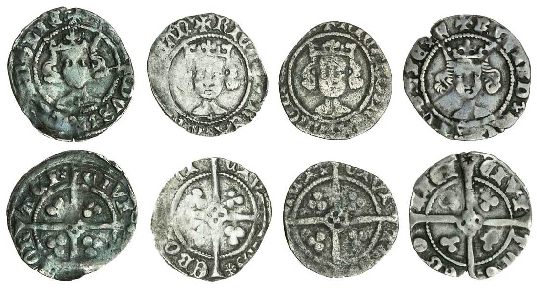 Richard II (1377-99), Pennies (4), York, London dies, type Ia, 1.08g, mm. cross pattée, ricardvs rex anglie, double saltire stops, Lombardic N, lis on breast, rev. civi tas ebor aci, a saltire after aci, quatrefoil with pellet at centre; type IIIa (2), 1.01g, ricard rex angl z fran, lis on breast, rev. civi tas ebor aci, a scallop after tas, no saltire, quatrefoil with pellet at centre; 0.95g, rev. a scallop after tas, a saltire after aci; type IV, 1.01g, ricard rex anglie f, bust with bushy hair, nothing on breast, rev. civi tas ebo raci, a saltire after tas, quatrefoil with r at centre (N.1329a, 1329e (2), 1329g; S.1690, 1695 (2), 1696; Stewartby p.266-7, the second pl.15/303 this coin), nearly fine to good fine, the last with a star countermarked on one arm of the reverse, this coin very rare (4)