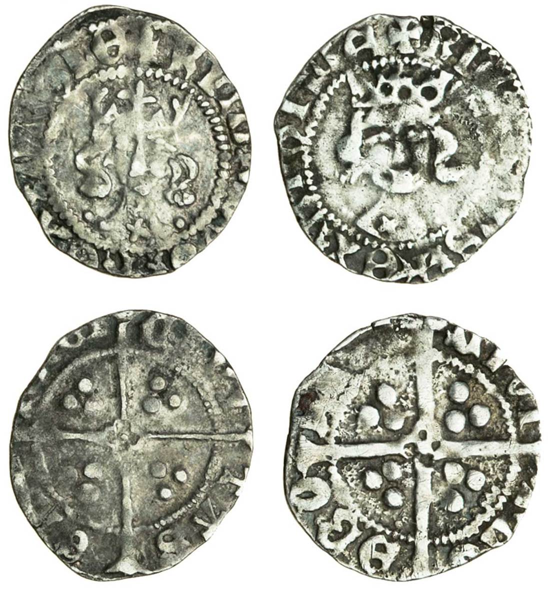 Richard II (1377-99), Pennies (2), York, local dies, Group B, 1.05g, mm. cross pattée, ricardvs rex angle, saltire stops, cross on breast, pellets by shoulders rev. civi tas ebo raci, quatrefoil with pellet at centre; Group D, 0.98g, angilie, cross on breast, pellets by shoulder, rev. saltire before civi, reversed e (N.1330b, 1330d; S.1692; Stewartby p.267, the second pl.15/303 this coin), both very fine, the second rare (2)