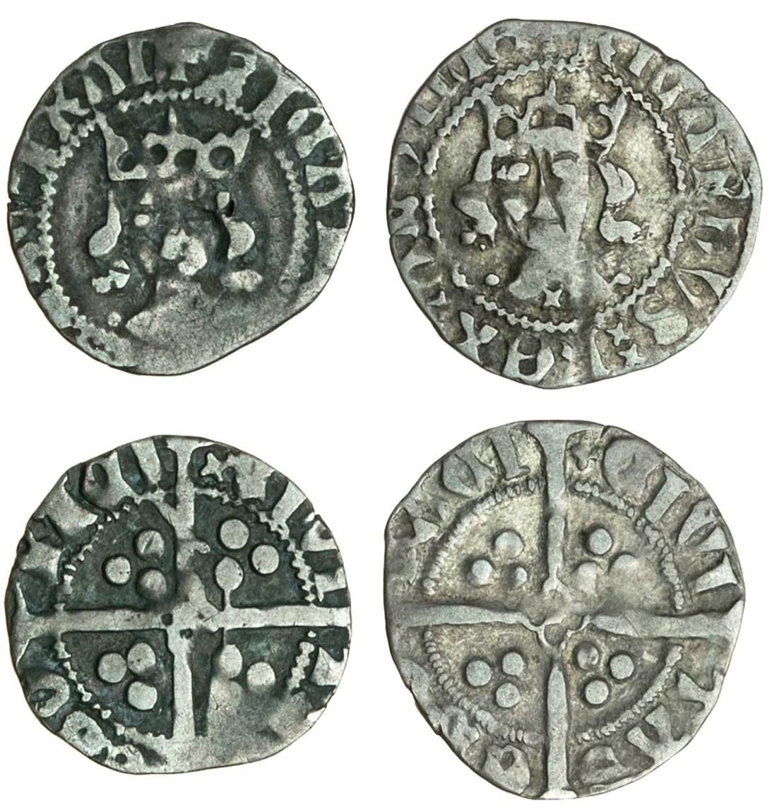 Richard II (1377-99), Pennies (2), York, local dies, Group D, 1.00g, mm. cross pattée, ricardvs rex angilie, saltire stops, cross on breast, pellets by shoulders rev. civi tas ebo raci, saltire before civi, normal e, Group E, 1.00g, ang fran, rev. as previous (N.1330d, 1330e; S.1692, 1694; Stewartby p.267), the first about very fine, the second fine, both rare (2)