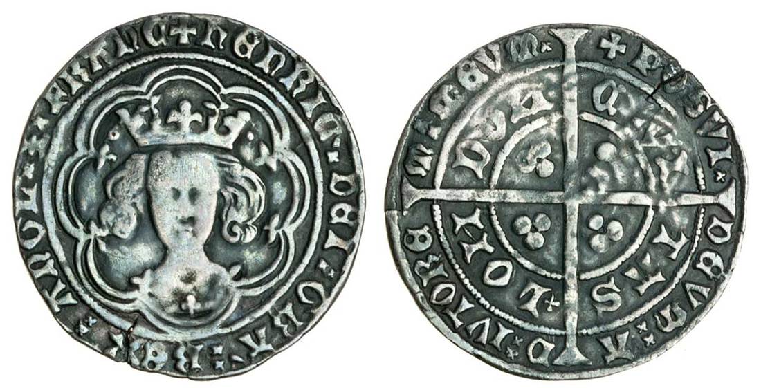 Henry IV (1399-1413), Groat, Light Coinage, type II, London, 3.63g, mm. cross pattée, henric dei gra rex angl z franc, saltire stops, annulet to left of crown and pellet to right, tressure of eight arcs, trefoil on breast, rev. posvi devm adivtorem mev, saltire stops, civi tas lon don, reversed Ns, trefoil before lon (Potter I/1; N.1359a; S.1727; Stewartby p.323, PII, 1/I-1), an edge split at 7 o’clock and smoothed on the portrait, toned, nearly very fine and extremely rare
