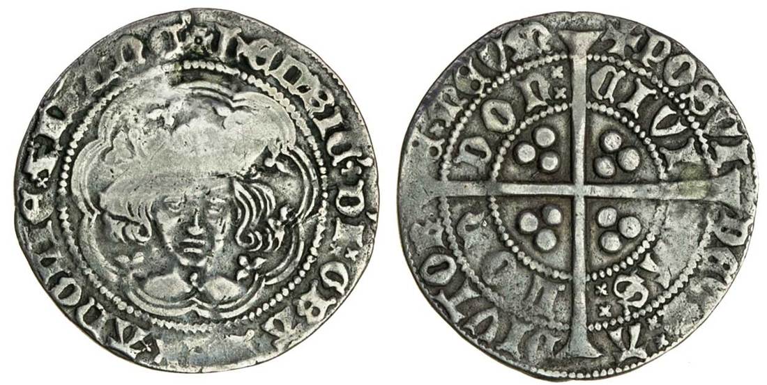 Henry IV or V, Groat, type A/B mule, London, 3.44g, mm. pierced cross with pellet/cross pattée, henric di gra rex anglie z franc, Lombardic Ns, quatrefoil after henric, double saltire after di, rev. posvi devm adivtore mevm, saltire stops, civi tas lon don, Lombardic Ns, saltires after tas (Potter 2/II; N.1385/1386; S.1759/1762; Stewartby p.323, A/B), weak on the crown, otherwise fine or better and very rare