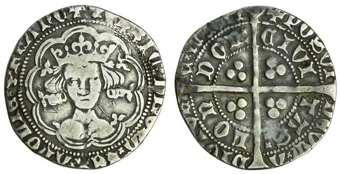 Henry IV or V, Groat, type B1b, London, 3.01g, mm. pierced cross with pellet, ‘Scowling bust’, no quatrefoil, Lombardic Ns, no fleurs above crown, rev. posvi devm adivtore mevm, saltire stops, civi tas lon don, Lombardic Ns, saltires after tas and don (Potter IIb3/II; N.1386; S.1762; Stewartby p.323, B1b), good fine or slightly better, rare
