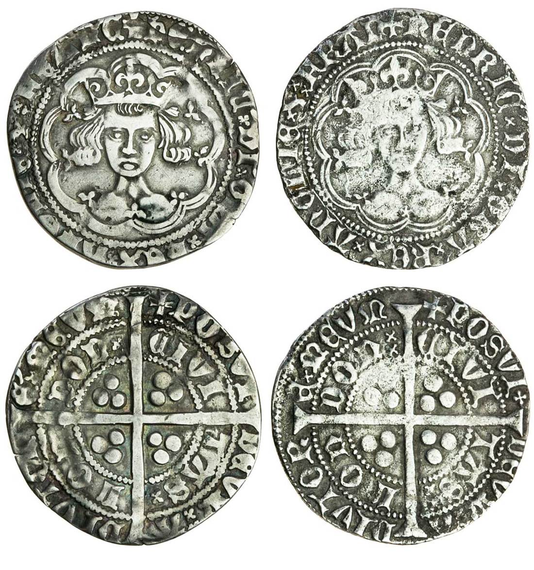 Henry V, (1413-22), Groats (2), type B2a*, London, 3.50g, mm. pierced cross, ‘Frowning bust’, quatrefoil after henric, Lombardic Ns, mullet added on right breast, rev. posvi devm adivtore mevm, saltire stops, civi tas lon don, Lombardic Ns, single saltires after tas and don; type B2b, London, 3.38g, legend ends fran, no quatrefoil after henric, mullet at centre of breast, rev. double saltires after tas and don (N.1387b; S.1765, 1764; Stewartby p.324, B2a*, B2b), very fine, the second with rough surfaces, fine, both very rare (2)