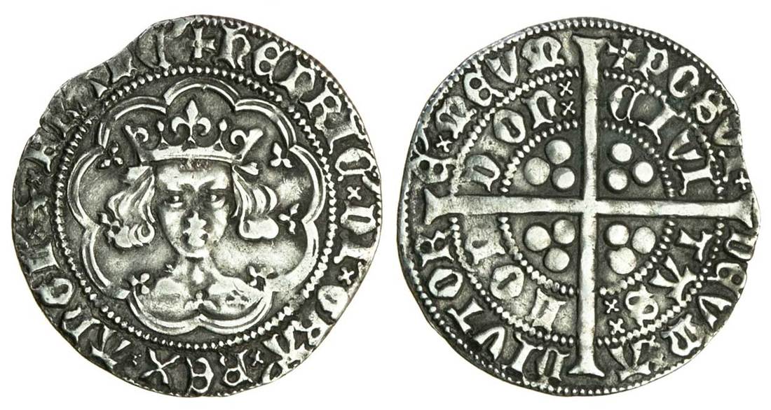 Henry V, (1413-22), Groat, type Ca, London, 3.38g, mm. pierced cross with central pellet, henric di gra rex angl z franc, ‘Frowning bust’, no quatrefoil after henric, Lombardic Ns, mullet on right of breast, rev. posvi devm adivtore mevm, saltire stops, civi tas lon don, Lombardic Ns, double saltires after tas and don (Potter VI; N.1387a; S.1765 Stewartby p.324, Ca), very fine