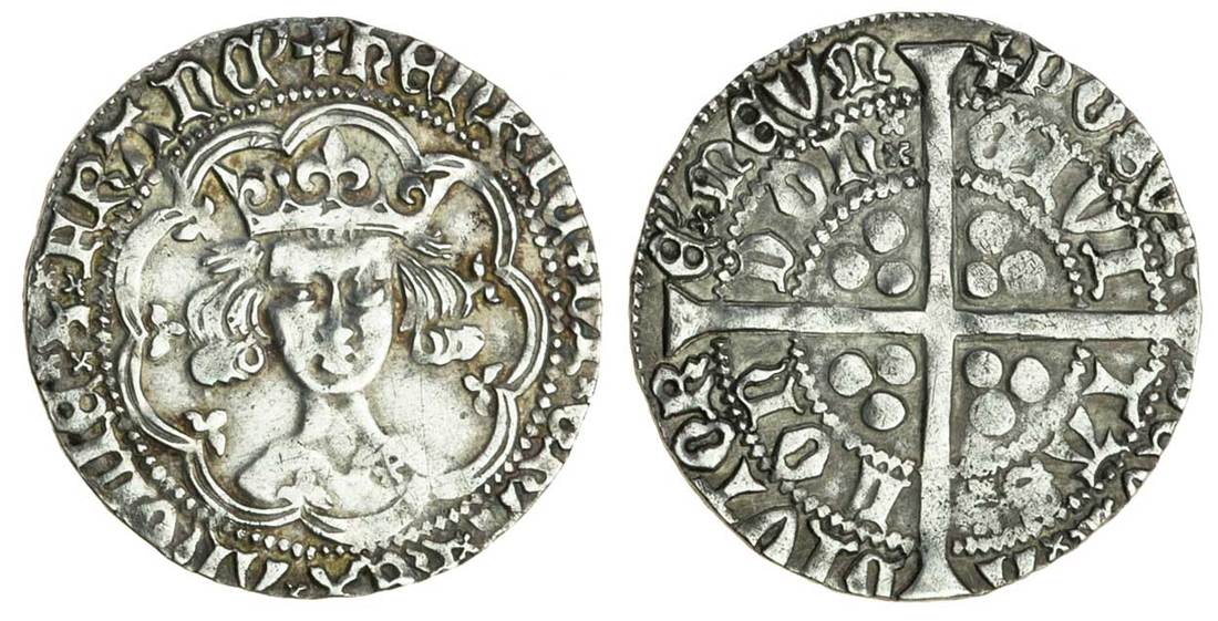 Henry V, (1413-22), Groat, type Ca, London, 3.38g, mm. pierced cross with central pellet, henric di gra rex angl z franc, ‘Frowning bust’, quatrefoil after henric, Lombardic Ns, mullet on right of breast, rev. posvi devm adivtore mevm, quatrefoil after posvi, saltire stops, civi tas lon don, Lombardic Ns, double saltires after tas and don (Potter VI; N.1387a; S.1765 Stewartby p.324, Ca and pl.18/338 this coin), very fine