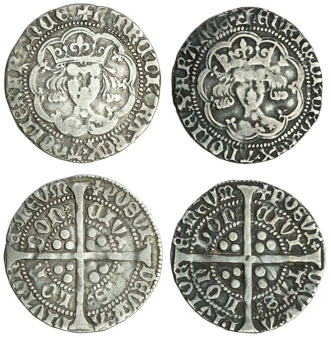 Henry V, (1413-22), Groats (2), type Cb, London, 3.73g, mm. pierced cross, reads henrc and france, no quatrefoil after henric, mullet on right of breast, rev. quatrefoil after posvi, double saltires after tas and don; 3.77g, henric and france (Potter VIIc; N.1387b; S.1765 Stewartby p.324, Cb), good fine, the second reverse better, rare (2)