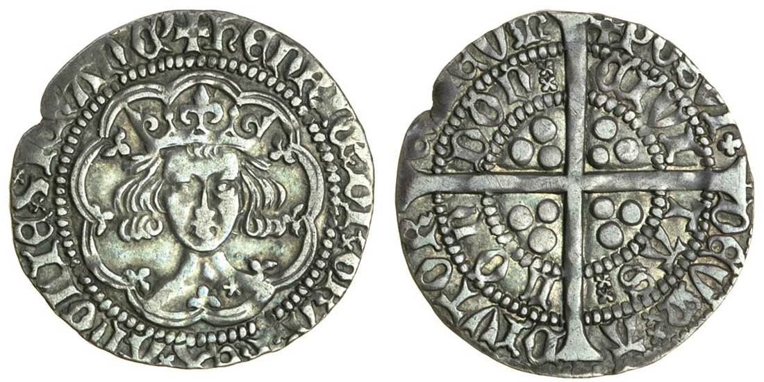 Henry V, (1413-22), Groat, type Cb, London, 3.79g, mm. pierced cross, henric di gra rex anglie z franc, ‘Frowning bust’, no quatrefoil after henric, mullet on right of breast, rev. posvi devm adivtore mevm, quatrefoil after posvi, saltire stops, civi tas lon don, double saltires after tas and don (Potter VIIa; N.1387b; S.1765 Stewartby p.324, Cb), toned, very fine