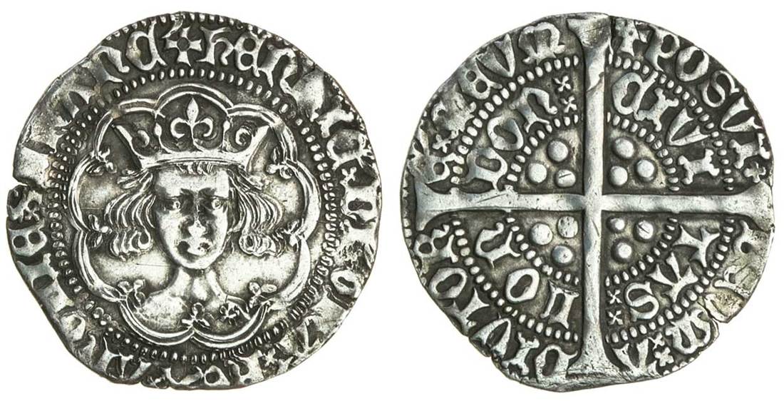 Henry V, (1413-22), Groat, type Cb, London, 3.71g, mm. pierced cross, henric di gra rex anglie z franc, ‘Frowning bust’, no quatrefoil after henric, mullet on right of breast, rev. posvi devm adivtore mevm, quatrefoil after posvi, saltire stops, civi tas lon don, double saltires after tas and don (Potter VIIc; N.1387b; S.1765 Stewartby p.324, Cb), very fine