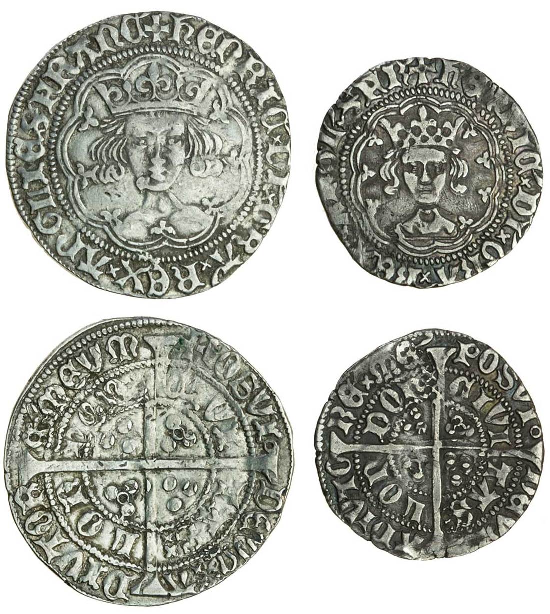 Henry V or VI, Groat, annulet issue, London, 3.51g, mm. pierced cross, henric di gra rex anglie z franc, fleur on breast, rev. annulet after posvi, double saltires after tas and don, annulet and three pellets in civi and lon quarters; Halfgroat, 1.78g, mm. pierced cross/-, henric di gra rex angl z fr, no marks, tressure of eleven arcs, rev. as previous (Whitton 1/2, 1a; N.1423, 1428; S.1835, 1839; Stewartby p.324 H, p.328 H), the reverses double struck, nearly very fine (2)