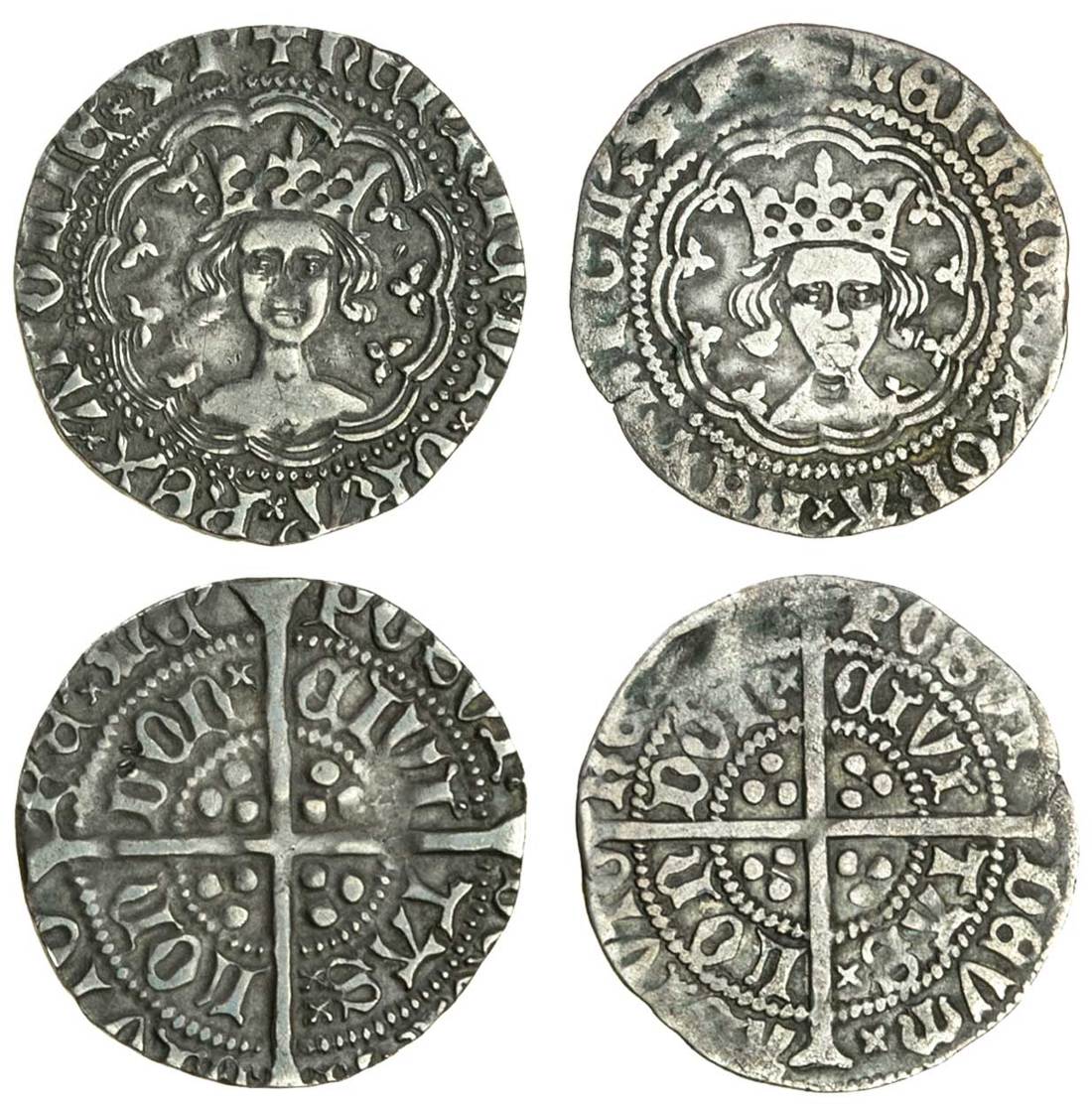 Henry V, (1413-1422), Halfgroats (2), type Ca, London, 1.91g, mm. pierced cross/-, henric di gra rex anglie z f, broken annulet to left of crown, mullet on breast, tressure of eleven arcs, top arches not fleured, rev. posvi devm adivtore me, quatrefoil after posvi, saltire stops, civi tas lon don, double saltire after tas and single after don; Cb, 1.75g, no annulet by crown or mullet on chest, rev. single saltire after tas and don (Potter VIc, VIa; N.1391a, 1391b; S.1771; Stewartby p.328; first BNJ vol.68, pl14/12 this coin), the first with two tiny digs to the reverse, otherwise very fine, the second good fine (2)