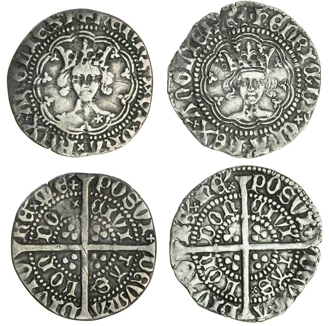 Henry V, (1413-1422), Halfgroats (2), type Cb, London, 1.66g, mm. pierced cross/-, henric di gra rex anglie z f, no annulet by crown, mullet to right on chest, tressure of eleven arcs, top arches not fleured, rev. quatrefoil after posvi, saltire stops, single saltire after tas and don; 1.85g, tressure of 10 arcs, top cusps fleured, broken annulet to left of crown, mullet in centre of chest, rev. single saltire after tas (N.1391b (2); S.1772, 1773; Stewartby p.328), good fine to very fine (2)
