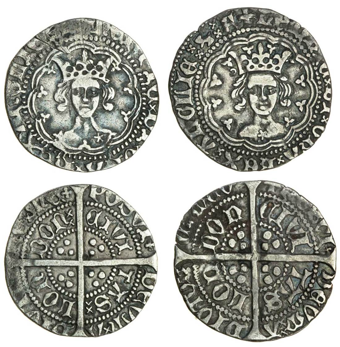 Henry V, (1413-1422), Halfgroats (2), type Ca, London, 1.80g, mm. pierced cross/-, henric di gra rex anglie z f, no annulet by crown, mullet to right on chest, tressure of eleven arcs, top arches not fleured, rev. quatrefoil after posvi, saltire stops, double saltires after tas and don; type Cb, 1.82g, tressure of 12 arcs, top cusps fleured, broken annulet to left of crown, mullet in centre of chest, rev. quatrefoil after posvi, ends mev, saltire stops, no inner marks (Potter VIc, VIIb; N.1391a, 1391b; S.1772, 1773; Stewartby p.328), nearly very fine (2)