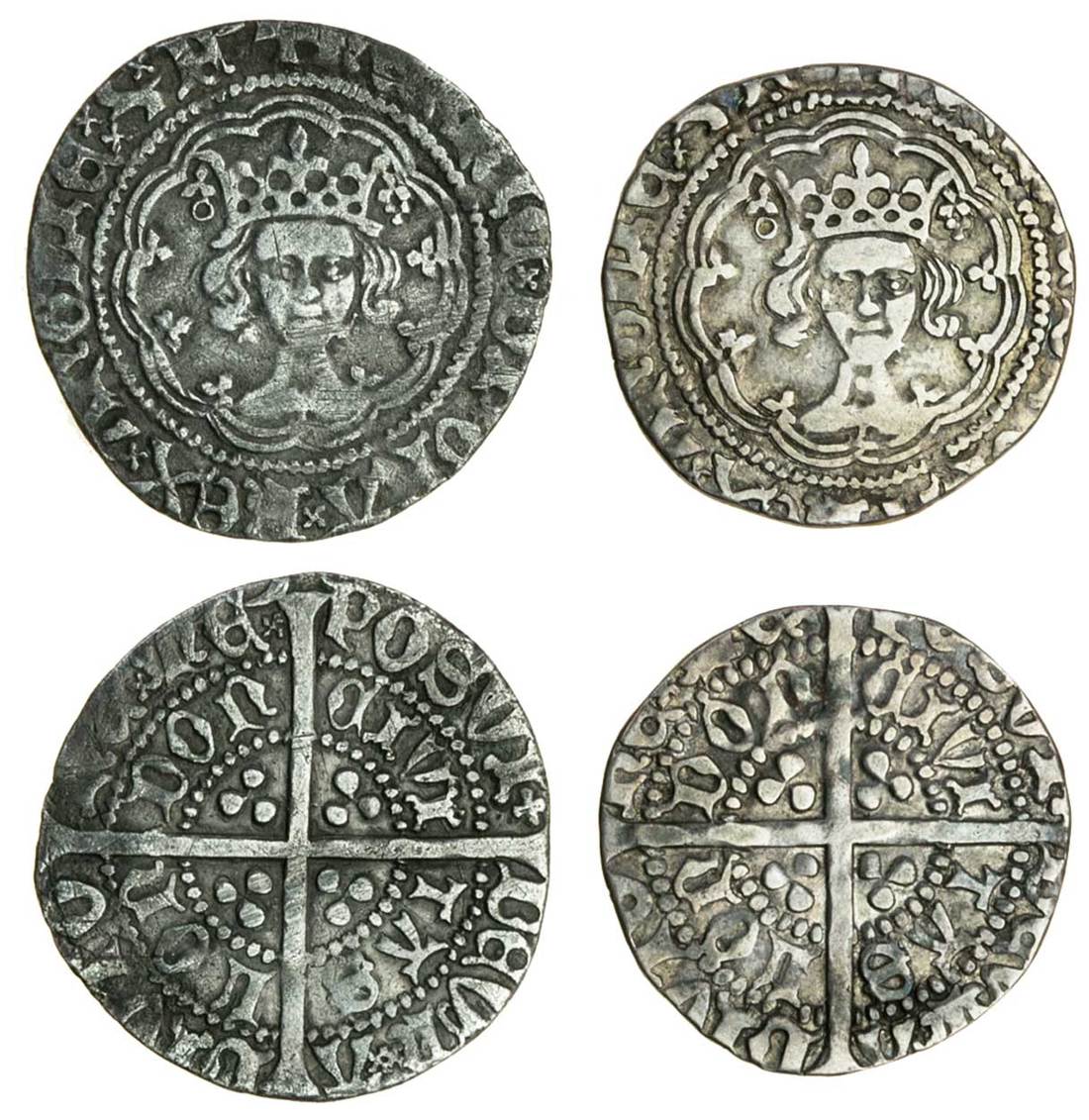 Henry V, (1413-1422), Halfgroats (2), type F, London, 1.60g, mm. pierced cross/-, henric di gra rex anglie z f, annulet left, trefoil right by crown, mullet centre on chest, tressure of eleven arcs, top arches not fleured, rev. quatrefoil after posvi, saltire stops, no inner marks; 1.65g, from different dies (Potter VIII; N.1392; S.1774; Stewartby p.328), nearly very fine (2)