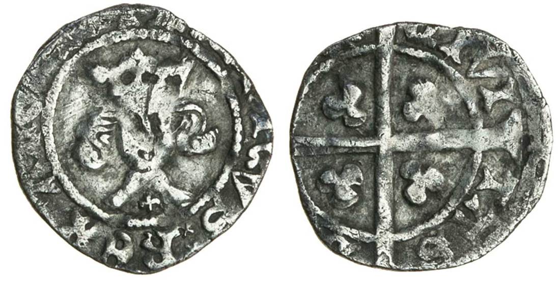 Henry IV (1399-1413), Penny, Light Coinage, Durham, 0.96g, mm. cross pattée, henricvs rex anglie, saltire stops, tall bust, trefoil on breast, rev. civi tas dvn olm, Lombardic Ns, no stops (N.1365; S.1735; Stewartby p.330), the reverse struck off-centre, almost very fine, very rare