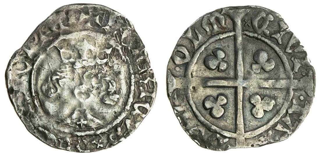 Henry IV (1399-1413), Penny, Light Coinage, Durham, 0.92g, mm. cross pattée, henricvs rex anglie, saltire stops, tall bust, trefoil on breast, rev. civi tas dvn olm, Lombardic Ns, saltire and pellets in legend (N.1365; S.1735; Stewartby p.330 Ab and pl.21/387 this coin), the obverse struck from a crudely engraved die with a broken crown, nearly very fine, very rare