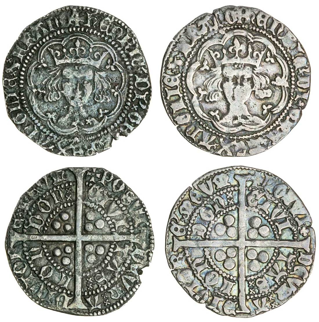 Henry V, (1413-1422), Groats (2), type C, London, 3.32g, mm. pierced cross, henric di gra rex anglie z franc, saltire stops ‘Frowning bust’, no fleurs above crown, mullet on right chest, rev. posvi devm adivtore mevm, quatrefoil after posvi, saltire stops, civi tas lon don, double saltires after tas and don; 3.55g, struck from different dies (N.1387b; S.1765; Stewartby p.324), the first cracked at 8 o’clock, the second with a small chip, good fine or slightly better (2)