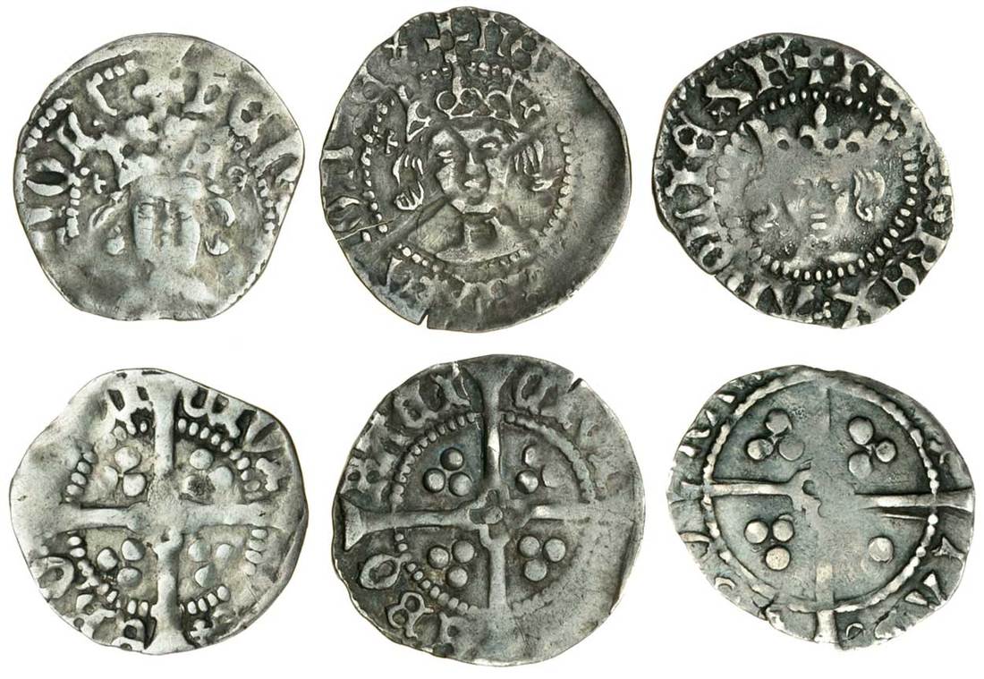 Henry V (1413-1422), Pennies (3), York, local/London dies (2), type D, 0.83g, mm. pierced cross, hen[ ]angli, saltire stops, bust 2, mullet to left, annulet to right of hair, rev. civi tas ebo raci, saltire after tas, quatrefoil and pellet at centre ; type F, 0.88g, bust 2, mullet to left, trefoil to right of crown, rev. as previous, no annulet in civi quarter; London/local dies, type C(?), 0.82g, henric rex anglie z f, saltire stops, bust 2, mullet to left, annulet(?) to right of crown, rev. annulet after tas, (N.1401/1397, 1403/1398, 1396/1400; S.1786/1779, 1788/1780, 1778/1785; Stewartby p.331; the second, BNJ vol.69 pl.19/Y17 this coin), the second very fine but cracked, otherwise fine or better, the last rare (3)