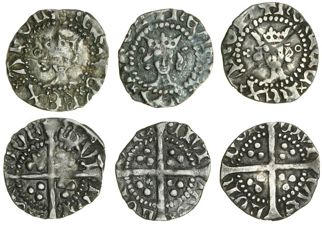 Henry V (1413-1422), Halfpennies (3), London, type C (2), 0.46g, mm. pierced cross, henric rex angl, double saltire stops, broken annulet to left of crown, rev. civi tas lon don, saltire under final n; 0.47g, broken annulet left and right of crown, rev. pellet before civi, saltire after tas and don; type F, 0.44g, single saltire stops, trefoil left, annulet right by crown, rev. no stops (N.1409 (2), 1411; S.1794 (2), 1796; Stewartby p.331), very fine or nearly so (3)