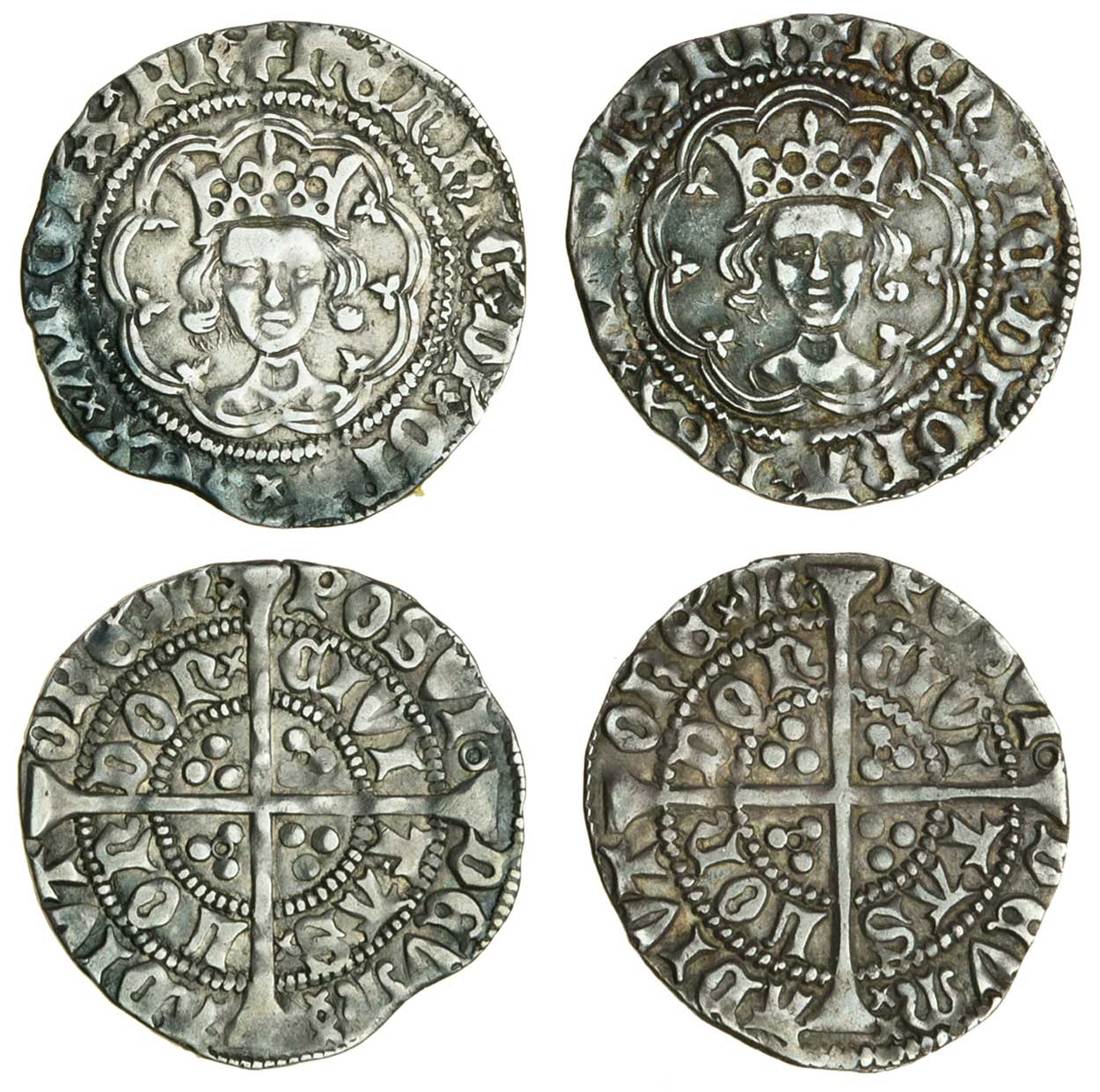 Henry VI, (1422-1461), Halfgroats (2), Annulet issue, London, 1.89g, mm. cross V/-, henric di gra rex angl z fr, saltire stops, tressure of nine arcs, rev. posvi devm adivtore m, annulet after posvi, saltire stops, civi tas lon don, single saltire after tas and don; 1.91g, mm. cross II/-, legend as previous, rev. no inner marks (N.1428 (2); S.1839 (2); Stewartby p.328, Ic, Ib), very fine and better (2)