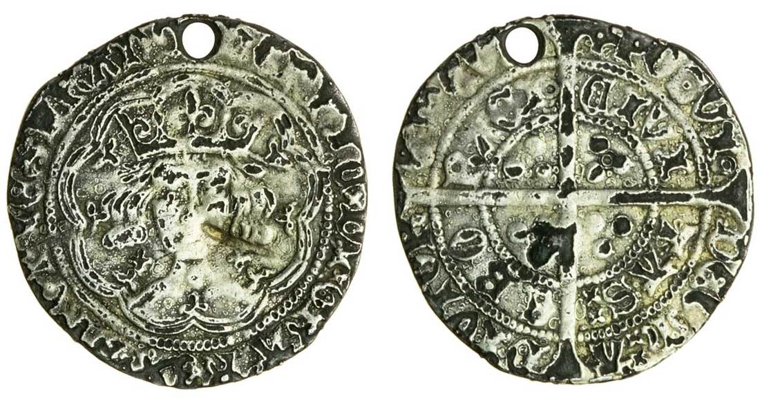 Henry VI, (1422-1461), Groat, Annulet issue, York, 3.15g, mm. cross II, anglie, lis by neck, rev. posvi devm adivtore mevm, annulet after posvi, saltire stops, civi tas ebo raci, double saltire after tas, annulet after don, three pellets in each angle, an annulet under civi and ebo (N.1425; S.1838; Stewartby p.324, Ib1), pierced, gilt and corroded, fair and very rare
