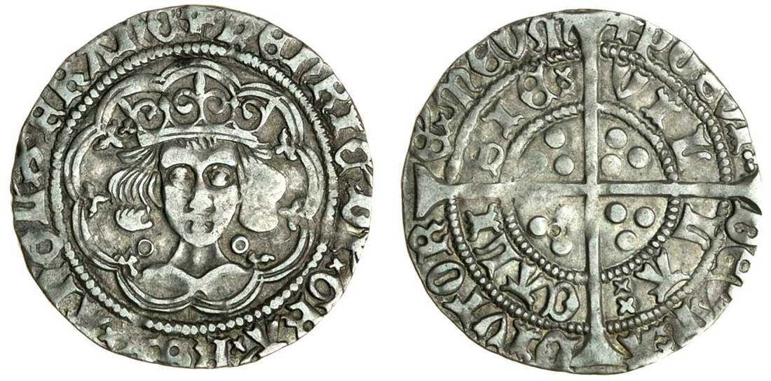 Henry VI, (1422-1461), Groat, Annulet-Trefoil sub-issue, Calais, 3.83g, mm. cross II/V, angl, trefoil to left of crown, annulets by neck, no fleur on breast, rev. trefoil after posvi, saltire stops, double saltires after la and sie, annulet under cali (N.1427; S.1854; Stewartby p.324, Id; Whitton 14), about very fine, rare