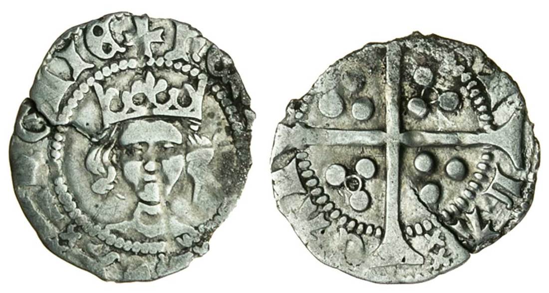 This rarity combines the bust and shoulder style of Henry V, type G, with a standard Henry VI initial cross and Calais penny reverse, and as such adds further fuel to the debate on the divide between Henry V & VI and the annulet issues which appear to bridge the succession. This was possibly an unfinished obverse die at the time of the succession, but given the bust punch used, could be earlier. It has been given to Henry VI as the type of initial cross is not known for Henry V and no pennies are known at Calais that can be positively attributed to him.