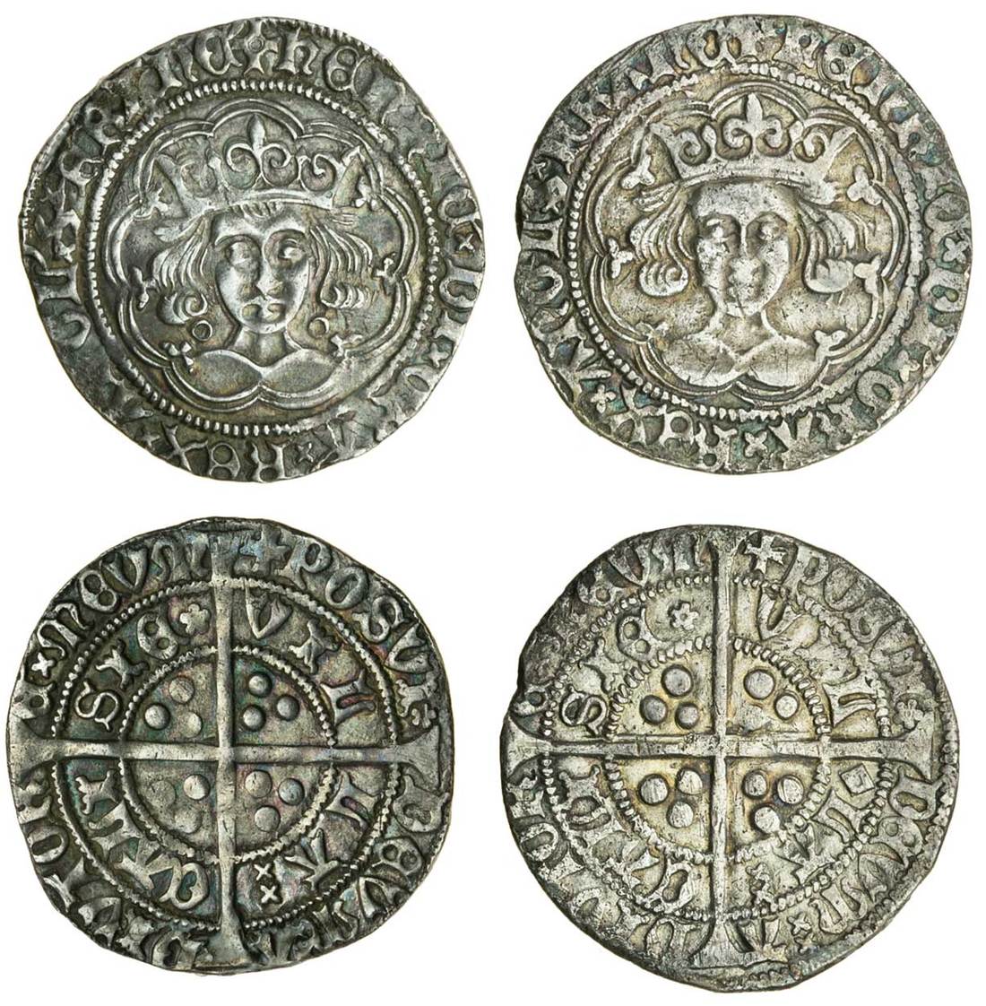 Henry VI, (1422-1461), Groats (2), Calais, Annulet/Rosette-mascle mule, 3.70g, mm. cross II/V, annulets by neck, rev. rosettes only in legend after posvi and sie only, no mascles; Rosette-mascle issue, 3.59g, no obverse marks, rev. rosettes and mascle in legend (N.1424/1446, 1446; S.1836/1859, 1859; Stewartby p.325, Ib/II, II; Whitton 12b, 15b), very fine, the second with pitted surfaces (2)