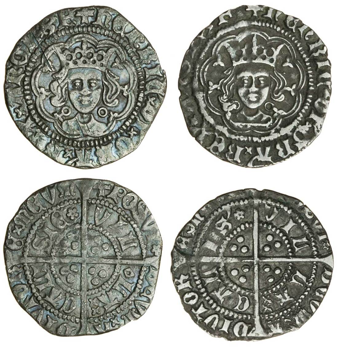 Henry VI, (1422-1461), Halfgroats (2), Calais, Annulet/Rosette-mascle mule, 1.79g, mm. cross V, henric di gra rex angl z f, saltire stops, tressure of nine arcs, annulets by neck, rev. rosette after posvi and sie, mascle before la; 1.74g, as previous but no mascle before la (N.1429/1448; S.1840/1862; Stewartby p.329, Ic/II), the first with a scored obverse, otherwise very fine or nearly so (2)