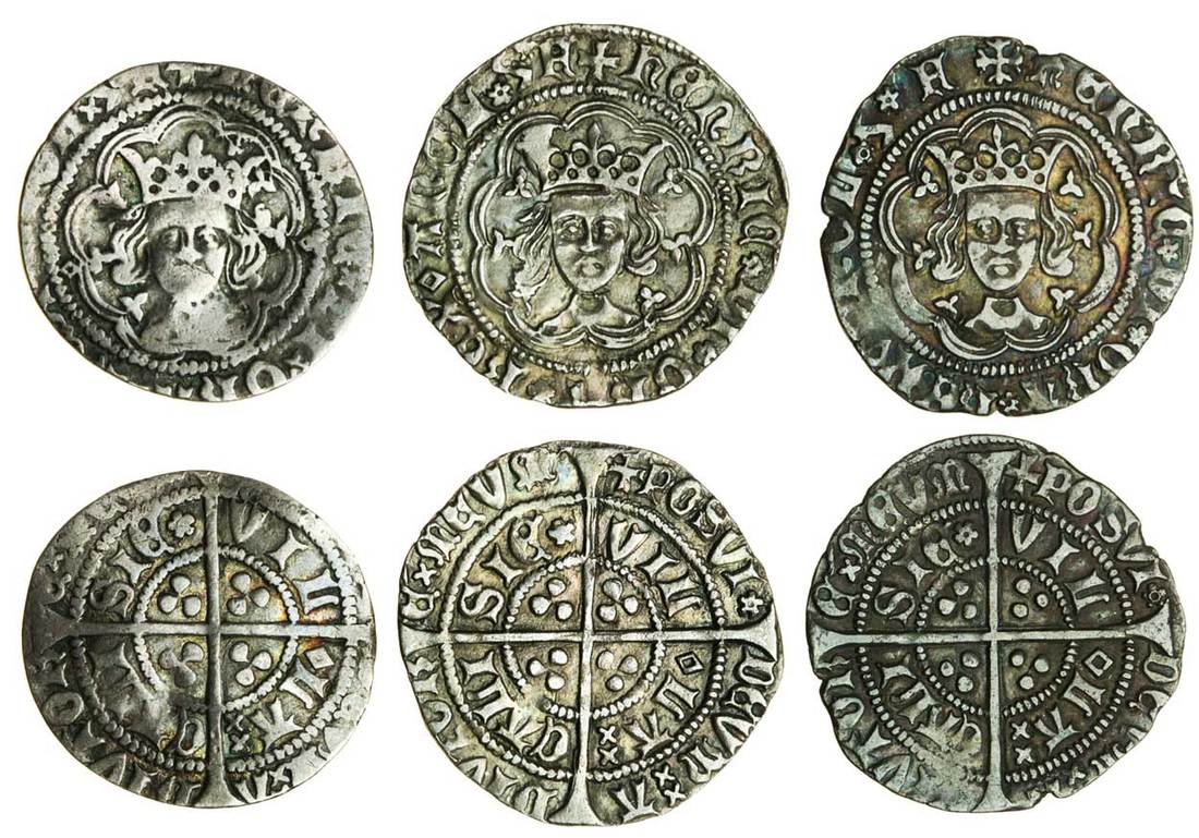Henry VI, (1422-1461), Halfgroats (3), Calais, Rosette-mascle issue, 1.79g, mm. cross V, mascles in two spandrels, rev. rosettes and mascle in legend; 1.85g, no mascles in spandrels, mascle after rex; 1.85g, mm. cross IIIa, otherwise as previous (N.1448; S.1863, 1862 (2); Stewartby p.329, Ic/II), the first clipped and fair, otherwise almost very fine to good very fine (3)