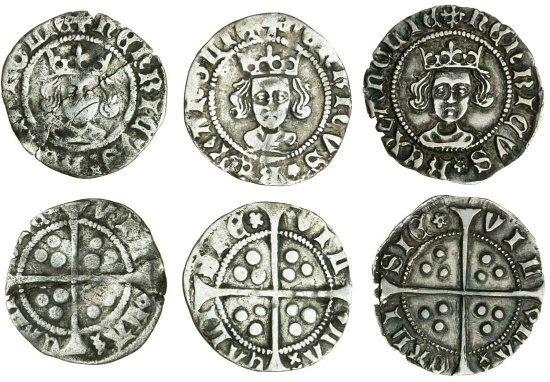 Henry VI, (1422-1461), Pennies (3), Calais, Rosette-mascle issue, 0.78g, mm. cross V/-, henricvs rex anglie, no rosettes or mascles on obverse, saltire stops, rev. vil la cali sie, mascle before la, rosette after sie; 0.78g, rosette before rex, mascle after; 0.90g, mm. cross IIIb, as previous (N.1450; S.1865; Stewartby p.332, IIa, IIc), the first cracked, nearly fine to good very fine (3)