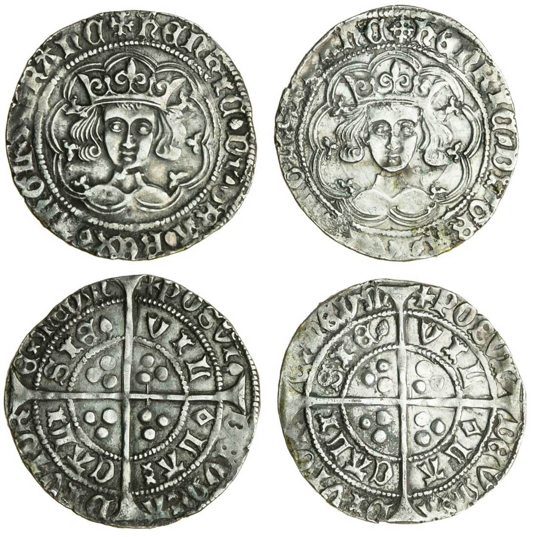 Henry VI, (1422-1461), Groats (2), Calais, Pinecone-mascle issue, 3.85g, mm. cross IIIa/V, pinecones in legend, mascle after rex, rev, pinecone after posvi and sie, mascle before la ; 3.66g, mm. cross IIIb/V, no saltires after la (N.1461; S.1875; Stewartby p.325, IIIa, IIIb; Whitton 28d, 30b var), very fine (2)
