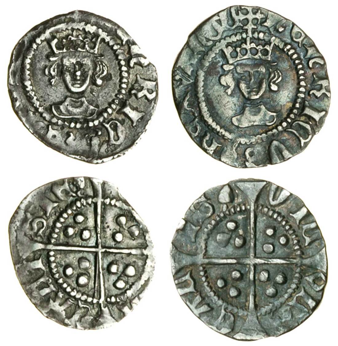 Henry VI, (1422-1461), Halfpennies (2), Calais, Pinecone-mascle issue, 0.45g, mm. cross IIIb/-, henric rex angl, rosette and mascle to both sides, rev. vil la cali sie; 0.53g, rev, vil la cal is (N.1469; S.1885; Stewartby p.335, III), the first struck off-centre, both very fine or better (2)
