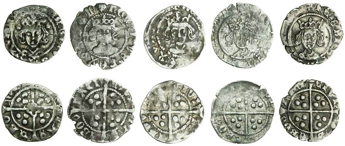 Henry VI, (1422-1461), Pennies (5), York under Archb. Kemp, Pinecone-mascle issue, 0.84g, mm. cross IIIb/-, henricvs rex anglie, pinecone before, mascle after rex, mullets by crown, rev. civi tas ebo raci, mascle before tas, quatrefoil at centre; 0.91g, no marks by crown, rev. mascle after ebo, no quatrefoil at centre; 0.96g, similar; 0.90g, obv. bust with mullet on breast, rev. pinecone after civi, mascle after ebo, no quatrefoil; 0.95g, angl, otherwise as previous (N.1466i, 1466ii (4); S.1880, - (2), 1882 (2); Stewartby p.333, IIIA, IIIB), fine to very fine, the first rare (5)