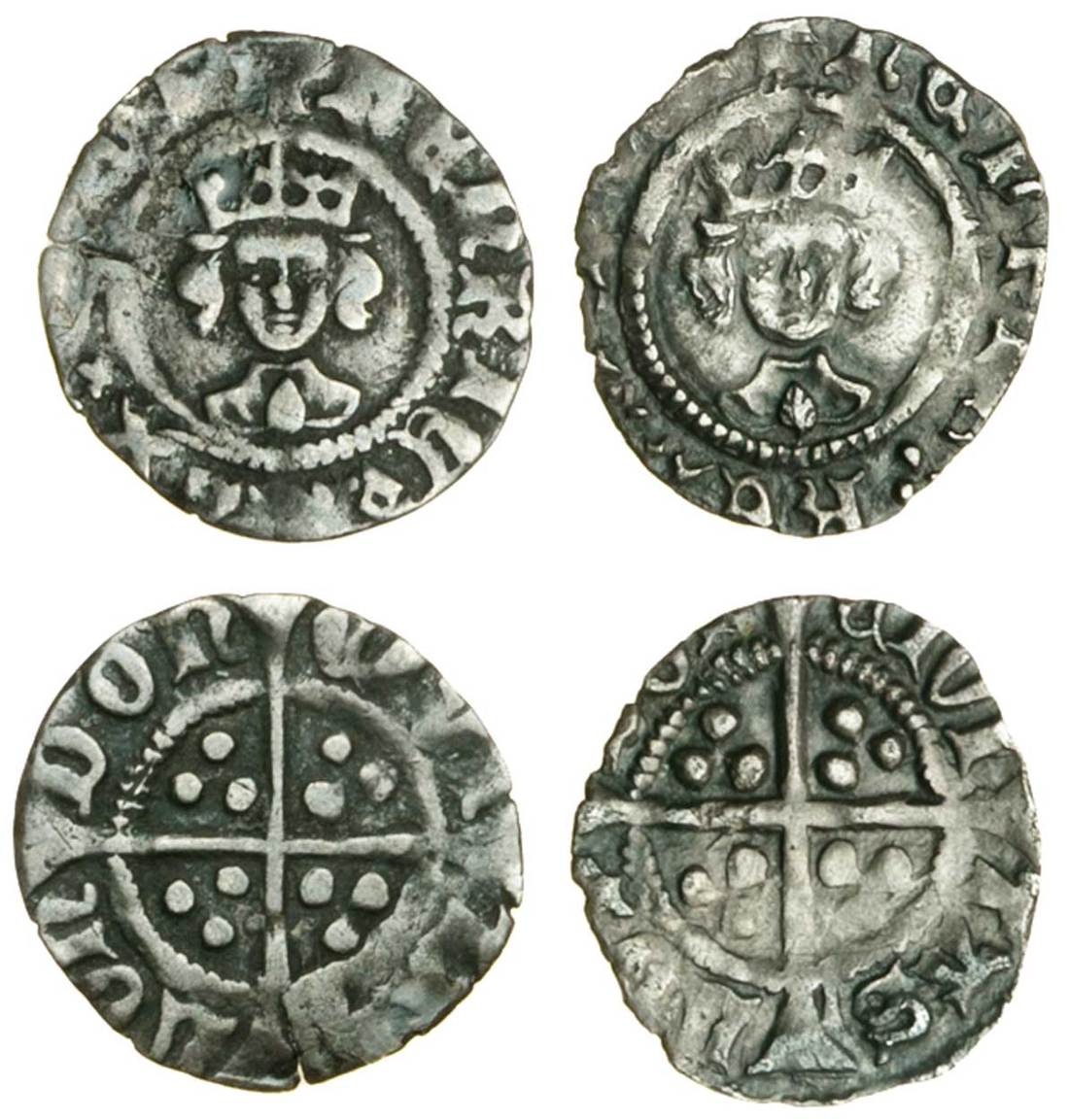 Henry VI, (1422-1461), Halfpennies (2), London, Leaf-mascle issue, 0.42g, mm. cross V/-, mascle before rex, leaf on breast, rev, leaf below tas; Leaf-trefoil issue, 0.43g, mm. cross V/-, trefoil before rex, leaf on breast, rev, no marks (N.1481, 1492; S.1896, 1905; Stewartby p.335, IV and pl.22/411 this coin), very fine, the first very rare (2)