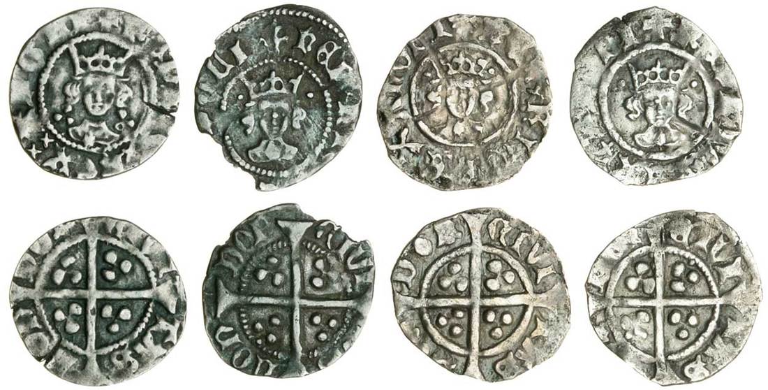 Henry VI, (1422-1461), Halfpennies (4), London, Trefoil issue, 0.73g, mm. cross V/-, henric rex angli, trefoils by neck, leaf on breast, rev, no marks; Leaf-pellet issue (3), 0.41g, hen ric rex angli, leaf on breast, pellets by crown, rev. extra pellet inner circle by civi and lon; 0.44g, as previous; 0.46g, mm. cross V/-, obv. legend as first coin, rev. extra pellet in civi and lon quarters (N.1500, 1512A (2), 1512B; S.1912, 1928 (2), 1929; Stewartby p.336, VI and pl.22/412 this coin, VIIIa (2), VIIIb), the second chipped, otherwise nearly very fine to very fine, the first rare (4)