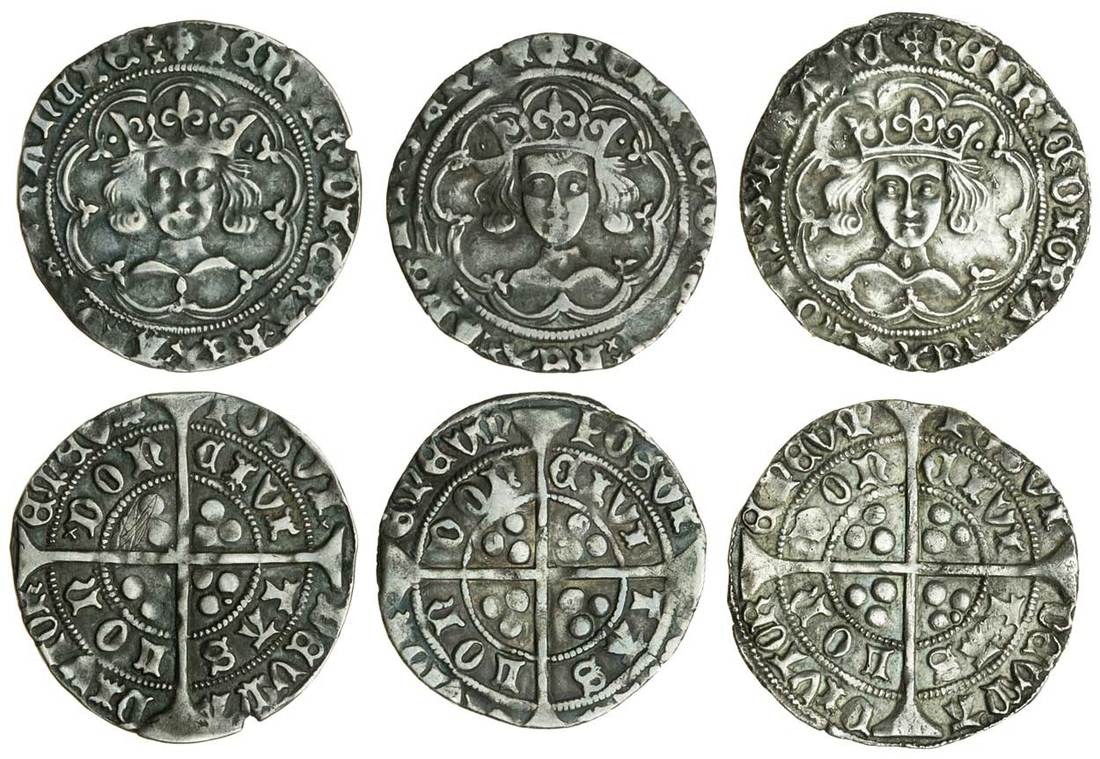 Henry VI, (1422-1461), Groats (3), London, Leaf-pellet issue, 3.60g, mm. cross IIIb/-, henric di gra rex angl z francie, leaf on breast, pellets by crown, rev, saltire after posvi and before don only, extra pellet in tas and don quarters; 3.60g, angli z franc, rev, no extra pellets, stops or marks; 3.79g, leaf on neck, fleur on breast, rev, no marks, extra pellet in tas angle and on inner circle by don (N.1503, 1504, 1505; S.1914, 1915, 1917; Stewartby p.326, VIIIa, VIIIb, VIIIc; Whitton 40d, 46/-, 57a this coin), the first with scratches to the reverse, toned, good fine to very fine (3)