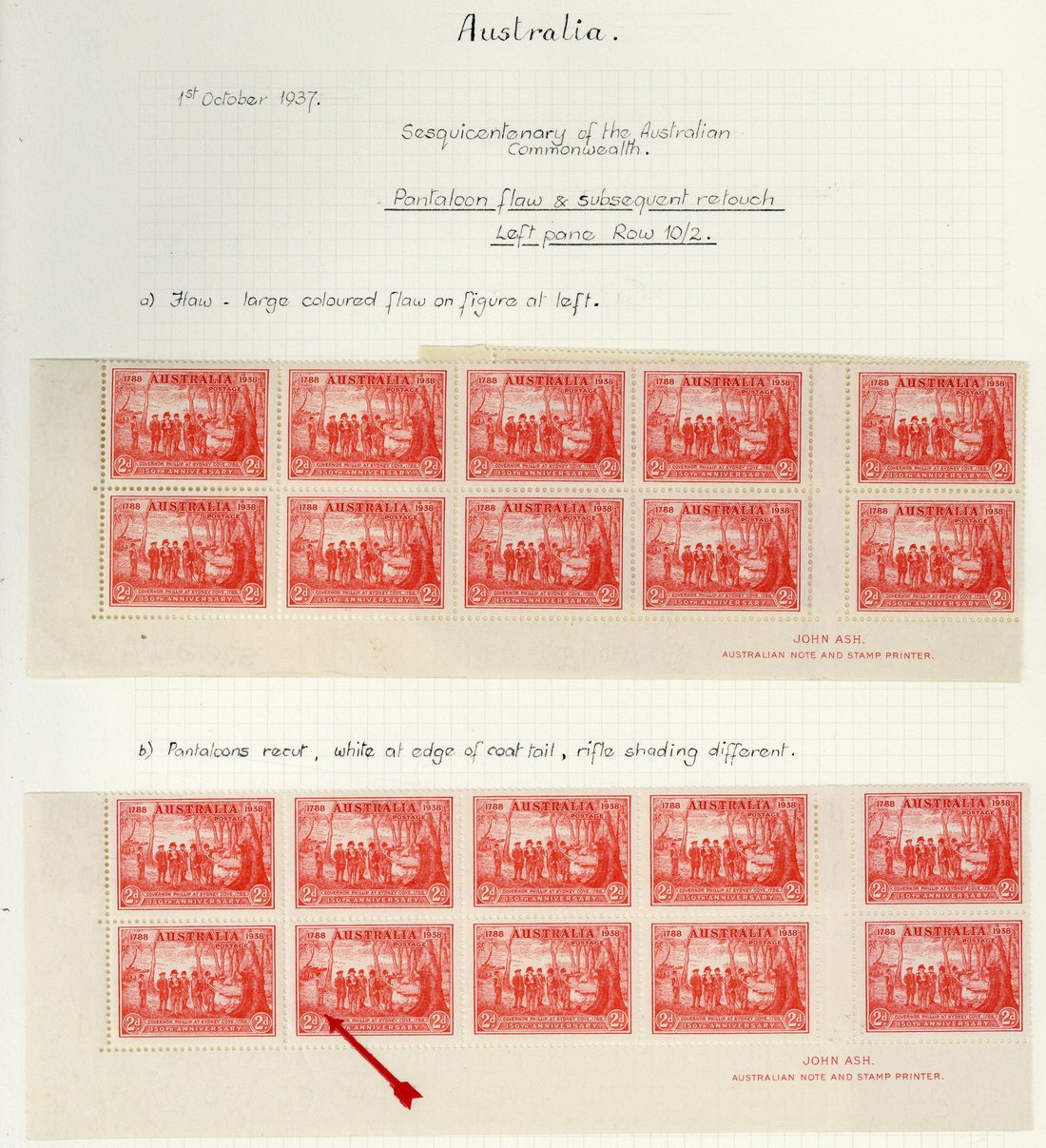 1937 150th. Anniversary of New South Wales, 2d. scarlet marginal blocks of eighteen and twelve from the foot of the sheet with imprint, showing "pantaloon" flaw (R. L10/2) and "pantaloon" flaw retouched respectively, fine mint. BW 172f, 172fa, $2,500
