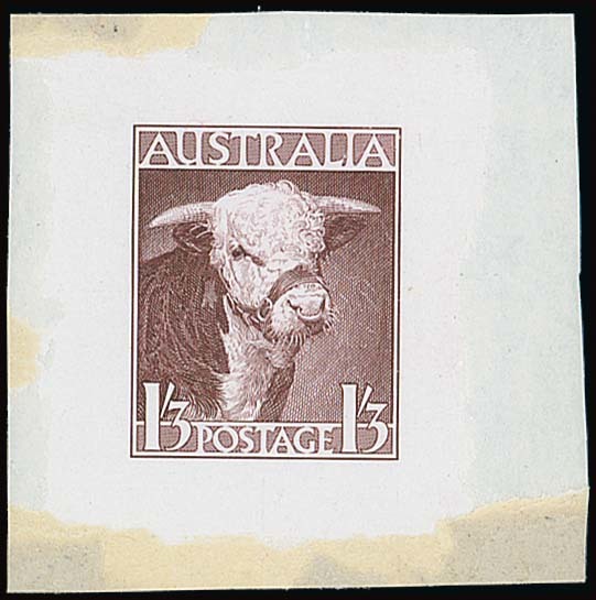 1948-49 Hereford Bull 1/3d. brown-purple die proof (45x45mm), some adherences at edges otherwise fine. BW 260DP(1), $4,000 for mounted in frame. Photo