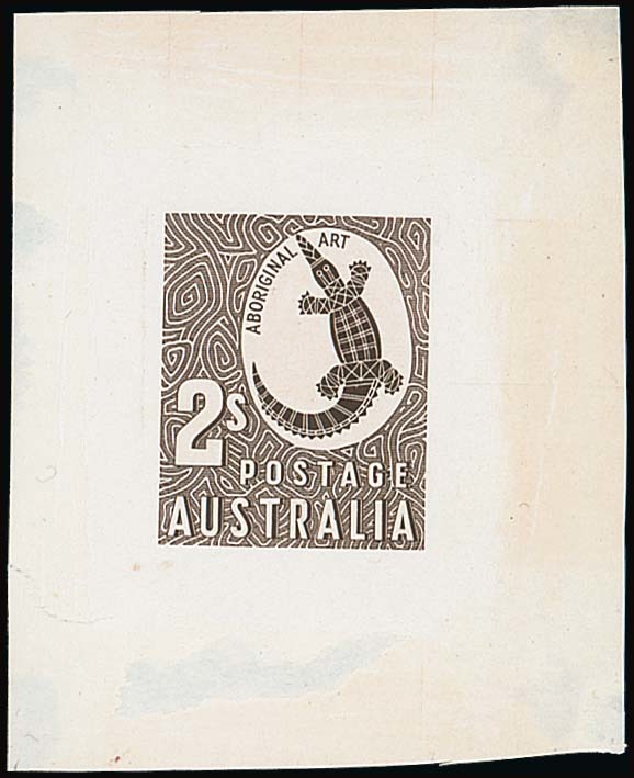 1948-49 Aboriginal Art 2/- chocolate (48x58mm), some thins in margins well clear of design, otherwise fine. BW 263DP(1), $4,000 for mounted in frame. Photo