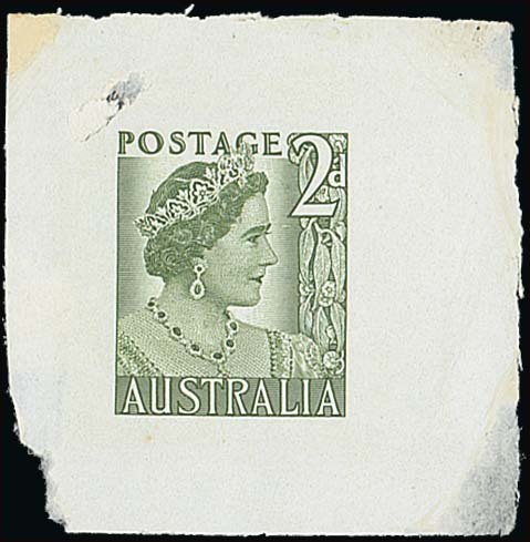 1950-52 Queen Elizabeth 2d. dull green die proof (40x40mm.), some thins etc. in borders. BW 248DP(1), $3,500 for mounted in frame. Photo