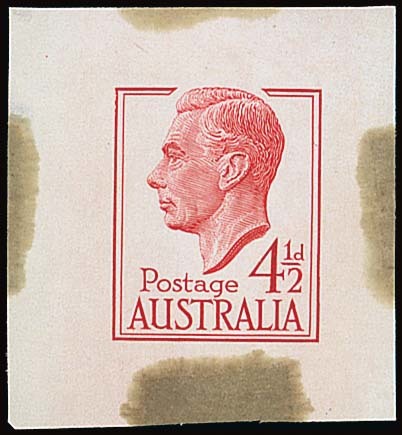 1951-52 King George VI 4½d. red die proof (33x35mm.), some affixative stains on all sides clear of design. BW 254DP(1), $3,500 for mounted in frame. Photo